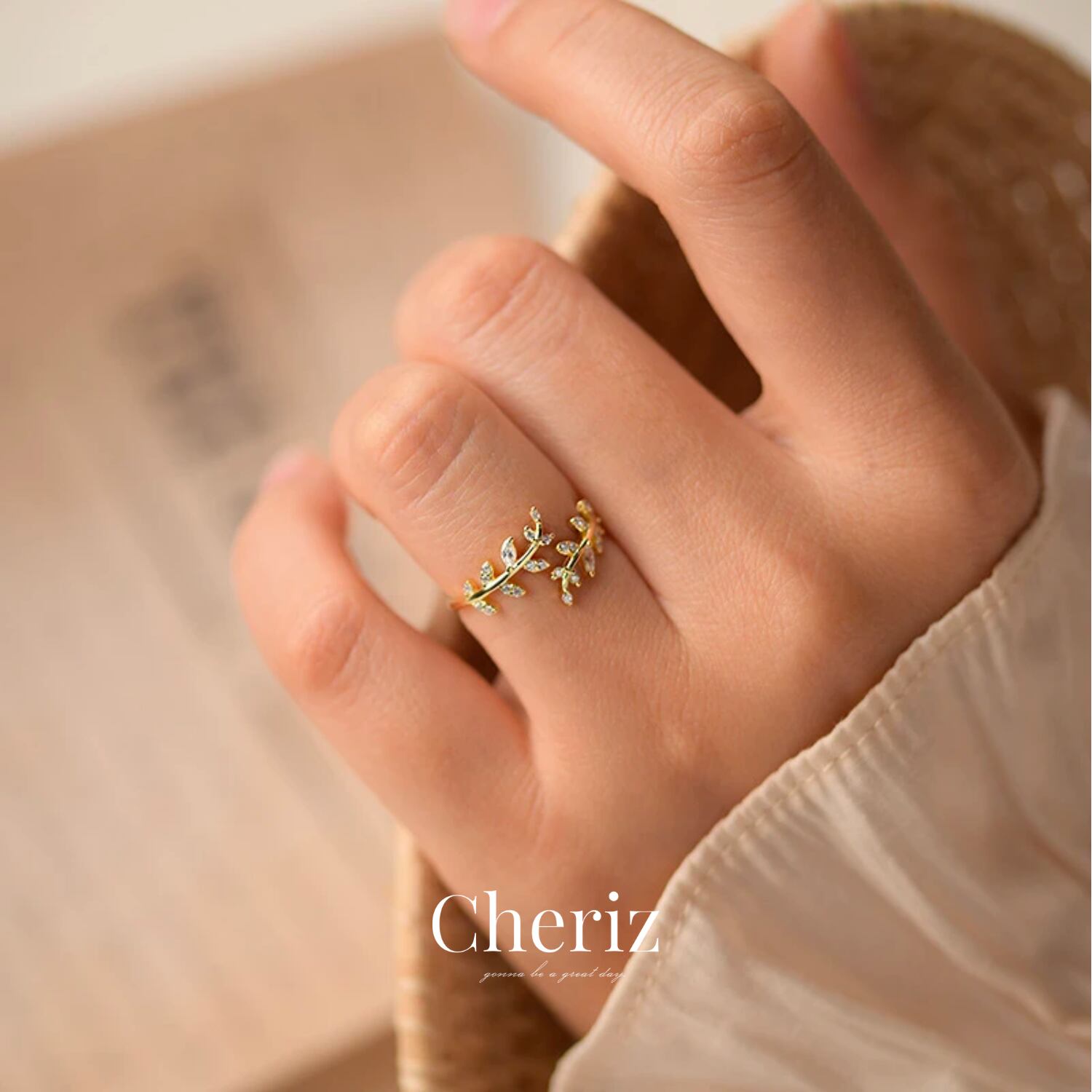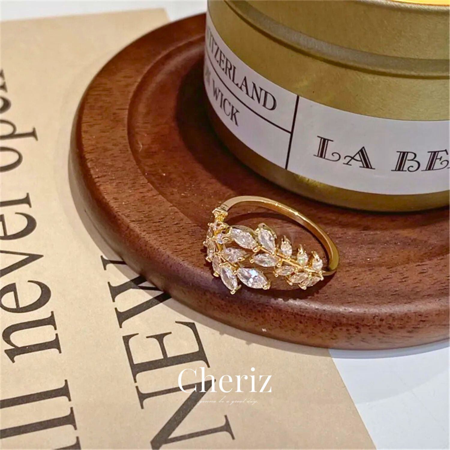 ジルコニアをあしらったリーフモチーフのリング。
