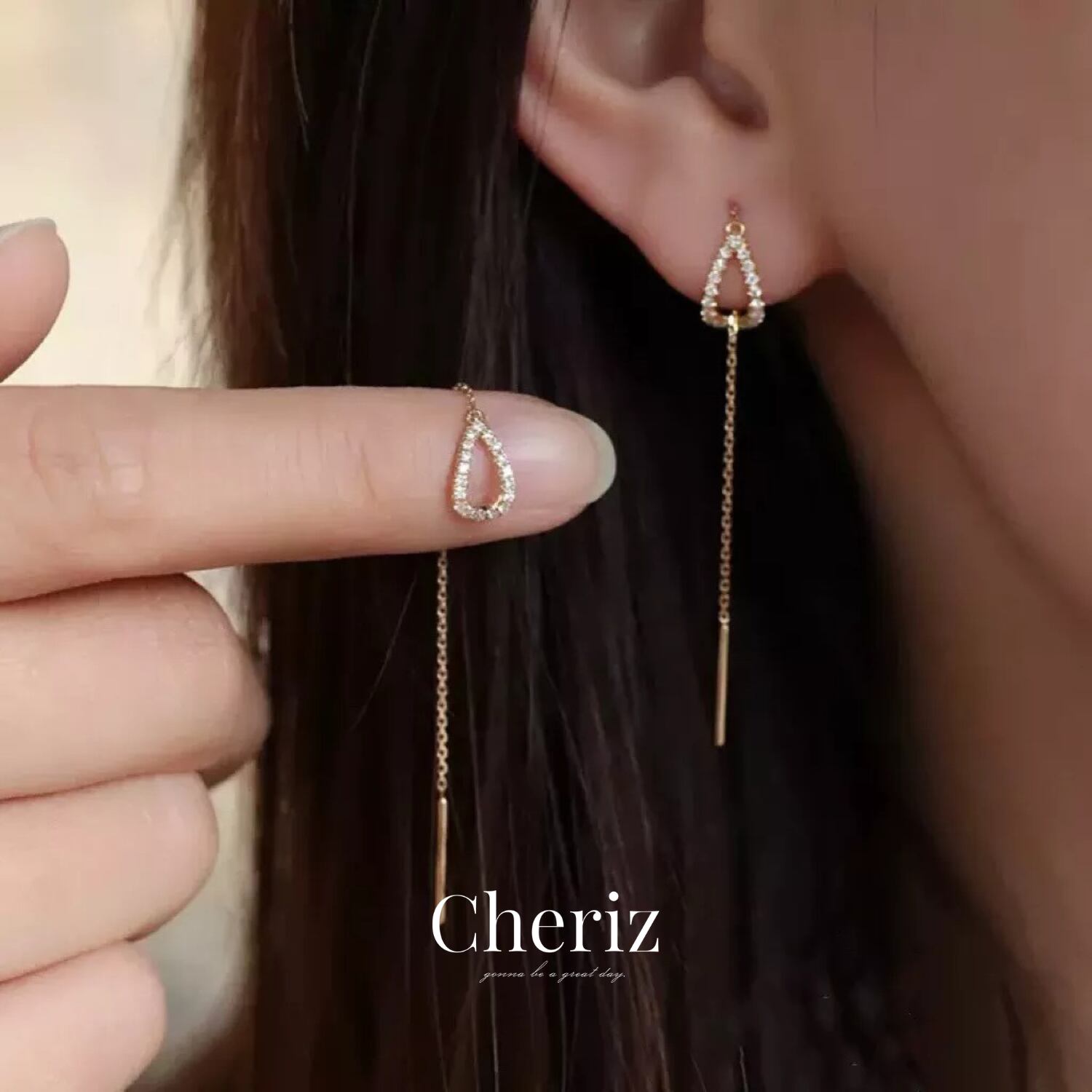ロングチェーンの揺れるピアスにジルコニアをプラス。