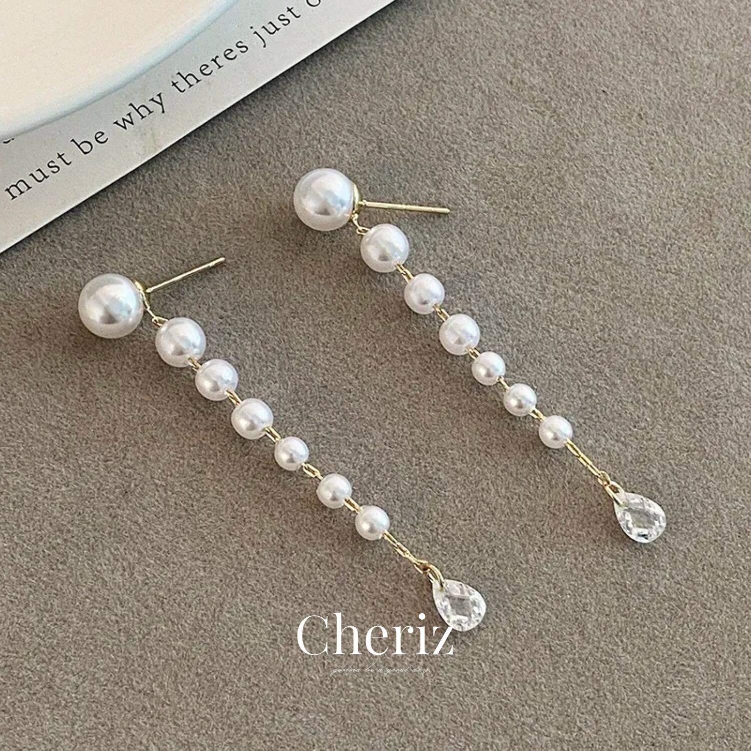 艶めくパールが連なる、煌びやかなデザインのロングタッセルピアス。